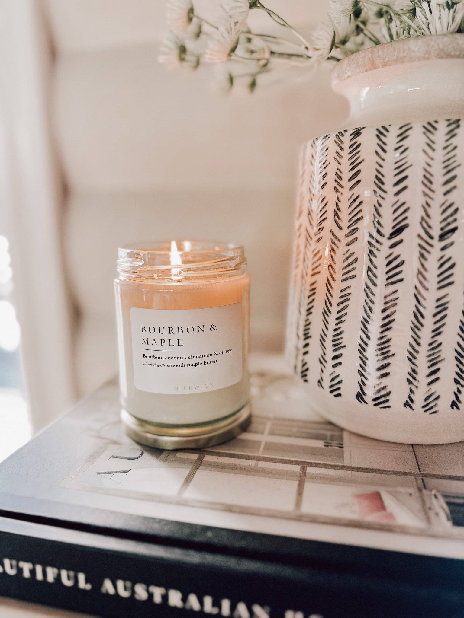 Bourbon, coconut, cinnamon and orange blended with smooth maple butter - Natural Soy wax - Premium fragrance oils - Made in Melbourne Burn time: Large = approx. 40 hours Extra Large = approx. 80 hours