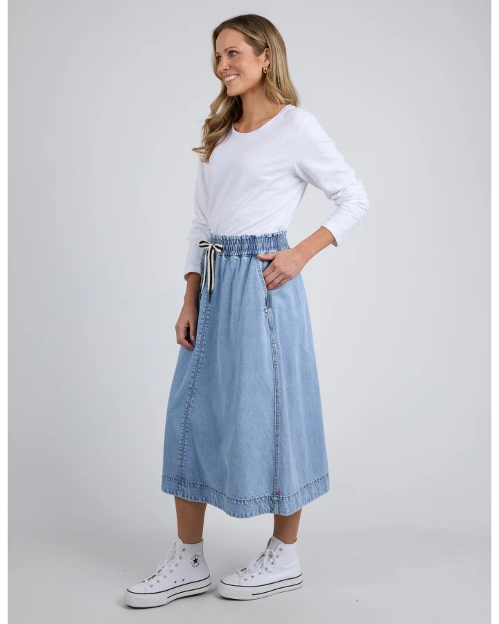 Inspired by our best-selling Greta Wide Leg Pant, the new Greta Skirt in mid-weight rigid denim is easy to wear and is ideal for those who prefer a denim skirt instead of jeans! Featuring a wide elastic with a drawstring waist for extra comfort, you will reach for this skirt repeatedly.