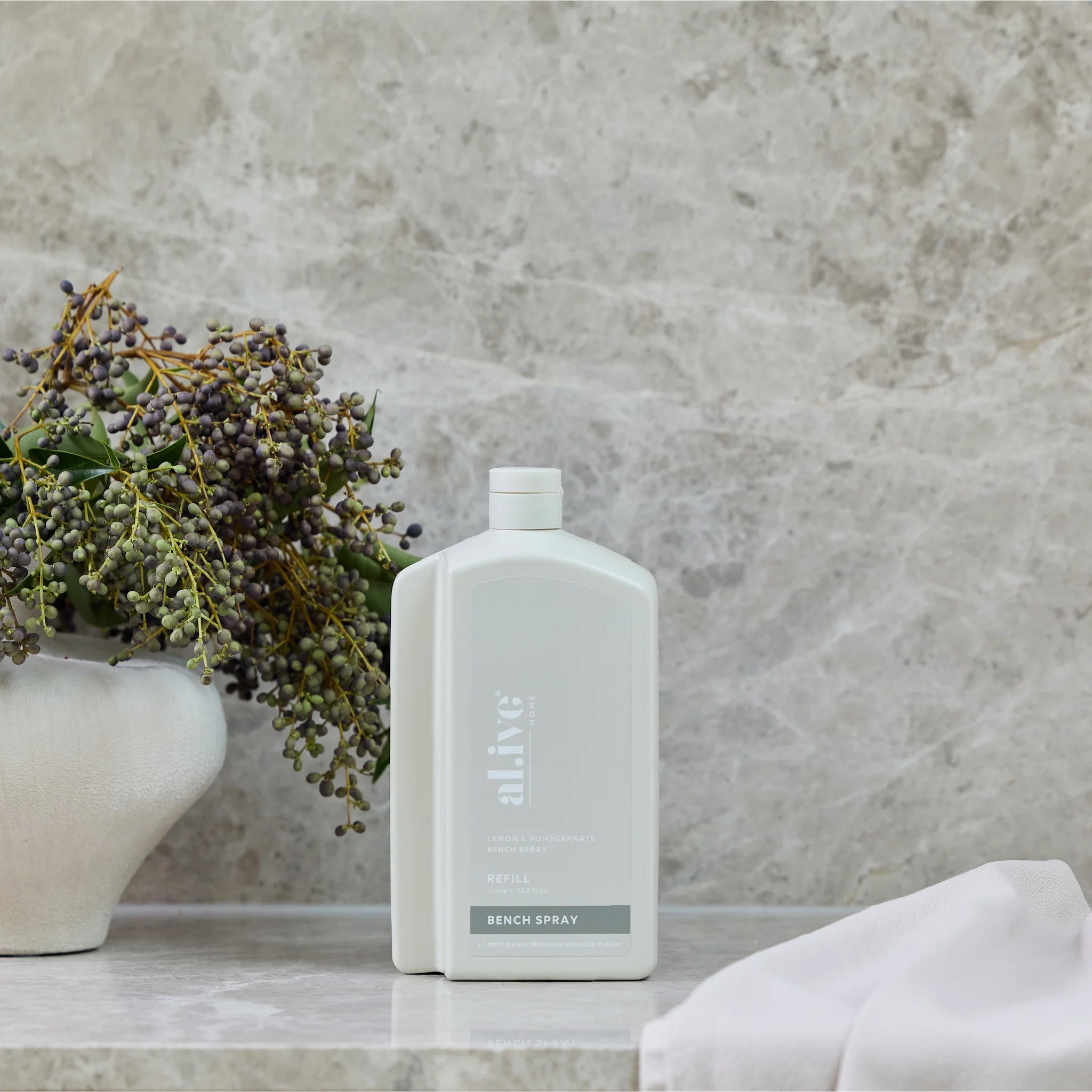 Refill your Lemon & Pomegranate Kitchen Bench Spray bottle with our 1 L Kitchen Bench Spray Refill. This sustainable refill solution is designed to reduce waste and offer a practical, eco-friendly way to top up your favourite al.ive body essential.